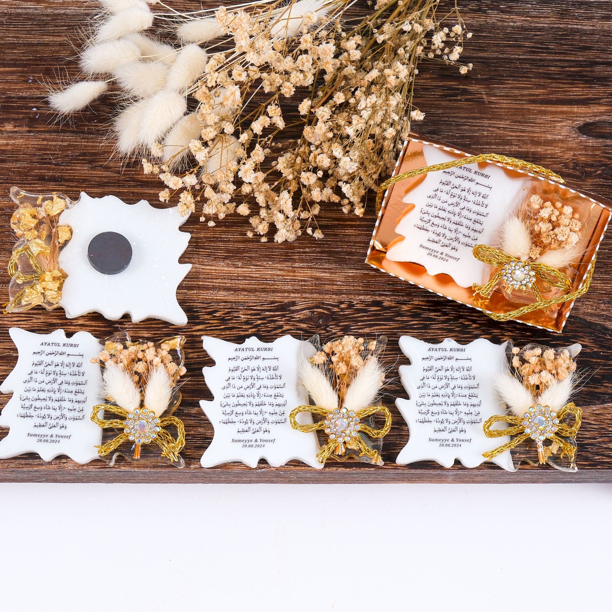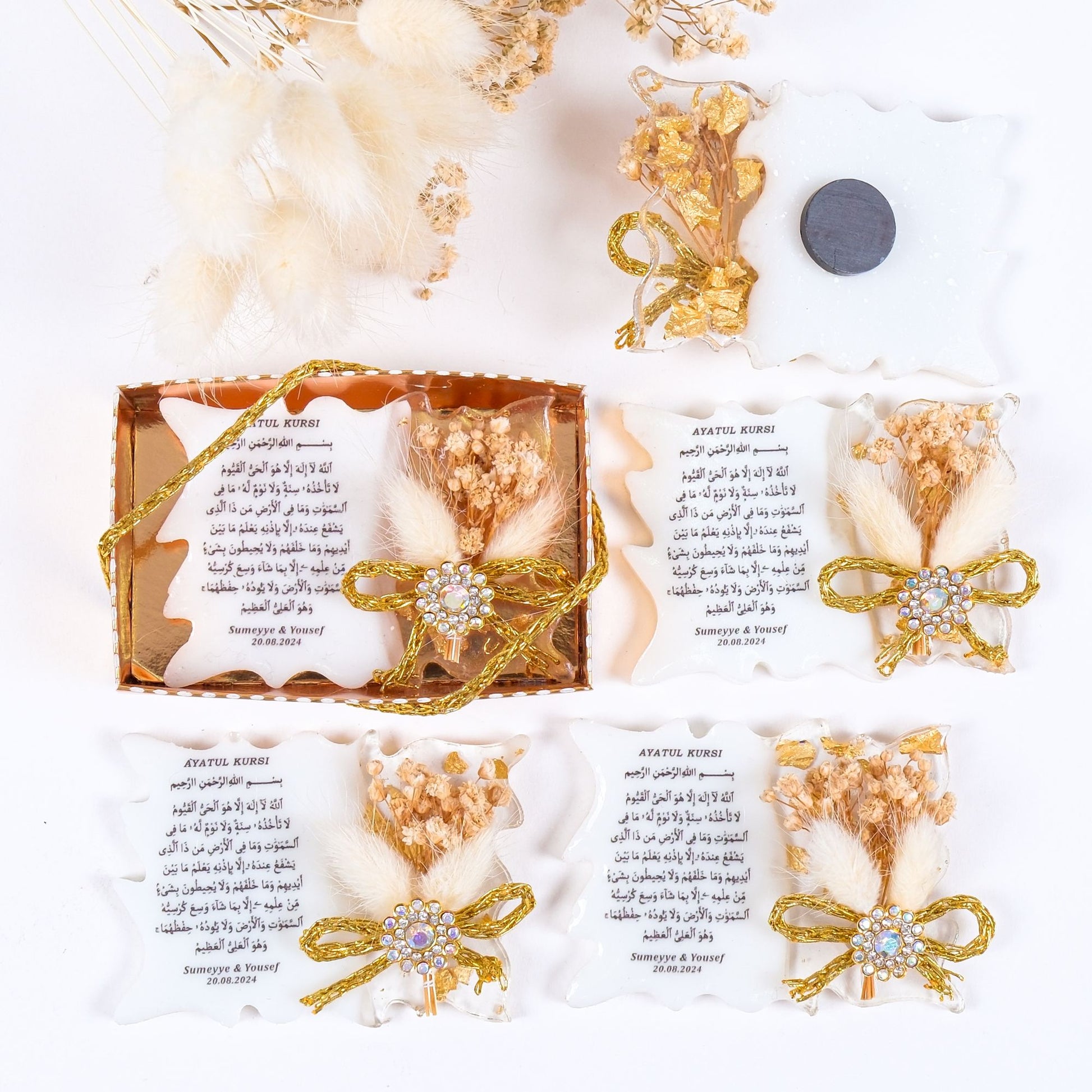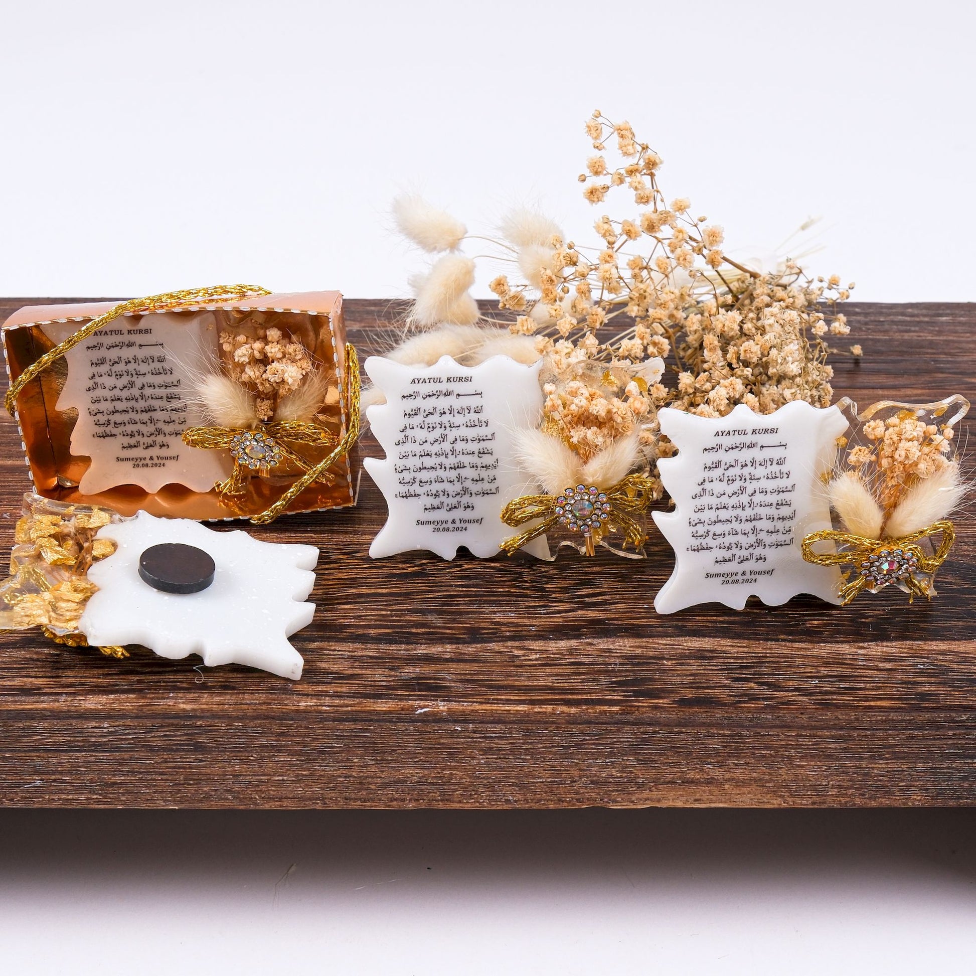 Sevdiklerinize özel ve kalıcı bir hatıra bırakın! Bu kişiye özel epoksiden yapılmış ve üzerine UV baskı ile Ayet-el Kursi yazılmış magnet, baby shower, mevlid veya doğum hediyesi olarak hem şık hem de işlevsel bir alternatif sunar.